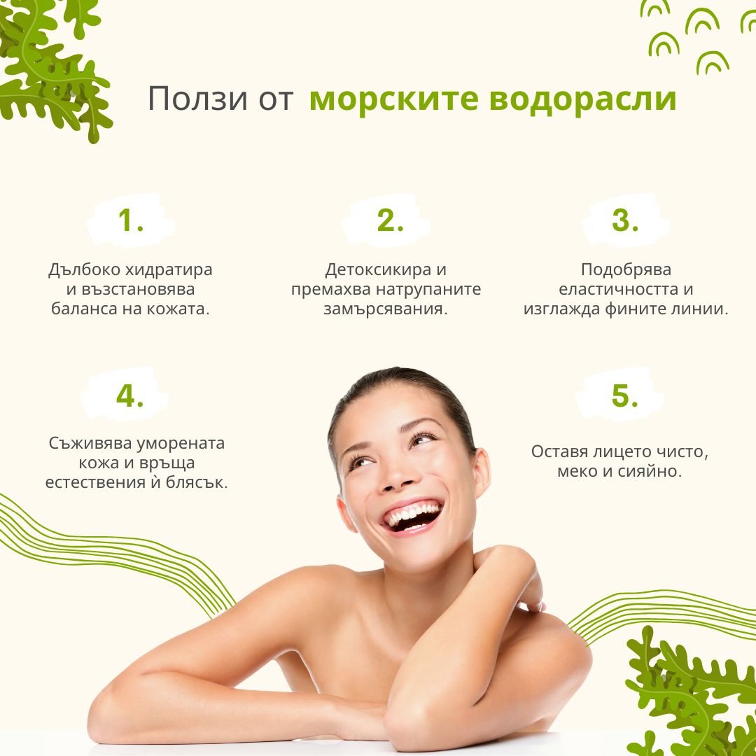 Потопи кожата си в дълбоката сила на морето с нашата маска за лице с морски водорасли – ревитализираща формула, съчетаваща природната енергия на морето с богатството на натуралните масла и растителни екстракти.